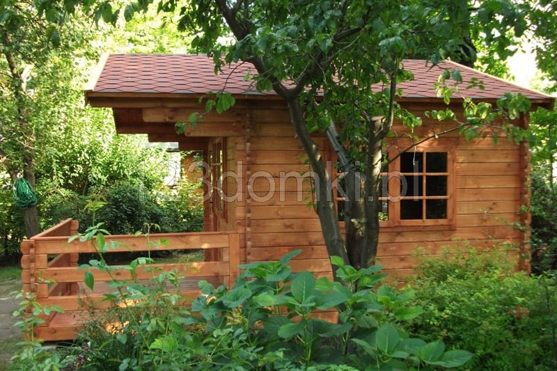 Domek działkowy o wymiarach balików 400x400cm (380x380cm po obrysie ścian) wykonany w technologii węgłowej z ostatkami. W standardzie domek na działkę wyposażony jest w nie podparty słupami mini taras o długości 110cm z zadaszeniem nad tarasem o długości 110cm (możemy wyprodukować taras o innych wymiarach np. 150cm, 200cm, 250cm, 300cm lub sprzedaży bez tarasu). Większe tarasy podpieramy słupami. Taras ma barierki z obu stron (możliwość dowolnych zmian np. jak na zdjęciach). Komórka (narzędziownia) ma powierzchnię ok. 3m2 – wymiary 250cm x 120cm, i jest jednopomieszczeniowa.