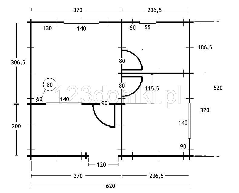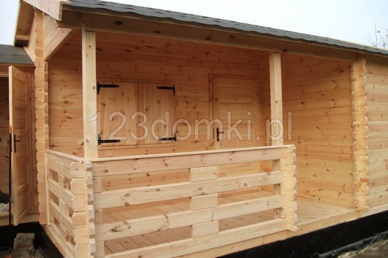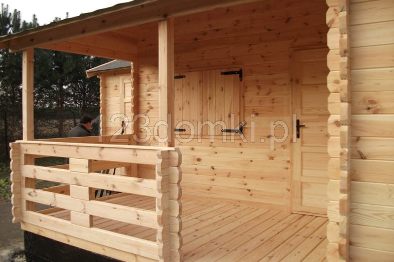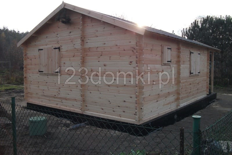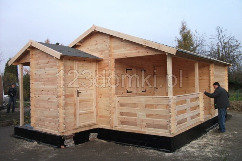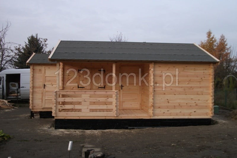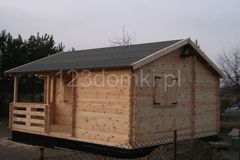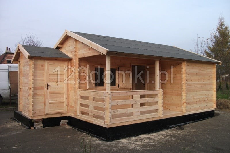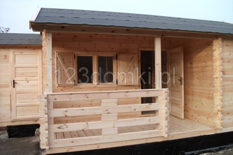 Domek letniskowy drewniany o wymiarach 6.20m x 5.20m z całkowicie zadaszonym tarasem o wymiarach 3.70m x 2.00m. Wewnątrz wydzielone duże pomieszczenie (tzw. pokój dzienny), sypialnia oraz łazienka. Dodatkowo obok domu znajduje się niezależne pomieszczenie gospodarcze (narzędziownia) o wymiarach 1.50m x 2.00m. Dom wyposażony w okiennice (opcja). Standardowe pokrycie dachu: papa bitumiczna. Możliwość pokrycia gontem bitumicznym (dowolny kolor i kształt).