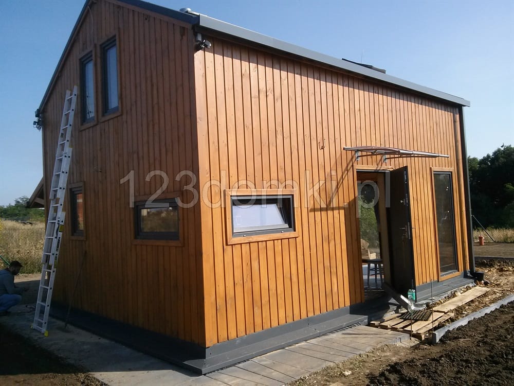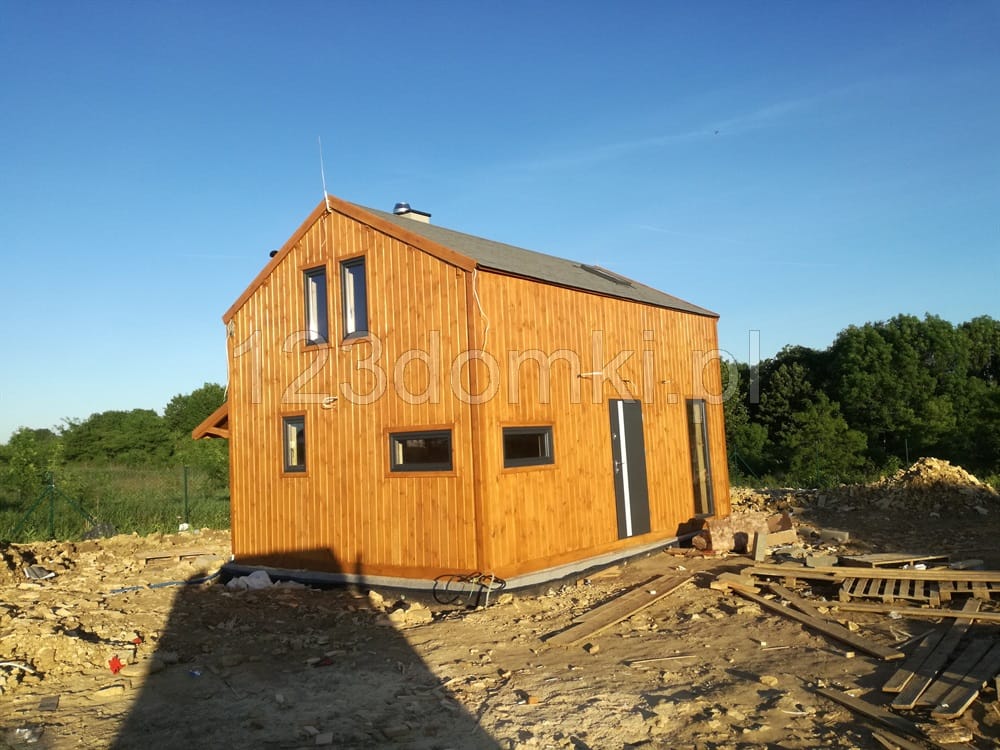 Nowoczesny domek letniskowy do 35m2 z poddaszem (lub opcjonalnie antresolą). Domek drewniany Śląskie-75 z pionowym deskowaniem elewacji dostarczamy tylko w wersji ocieplonej z montażem. Domek na zdjęciach wyposażony jest dodatkowo w obróbki blacharskie dachu i przyziemia, metalowe rynny oraz okno dachowe, które wykonane zostały przez właściciela (nie oferujemy tych opcji). Oferujemy szereg opcji dodatkowych dla domku letniskowego (np. malowanie elewacji, gont bitumiczny itd)