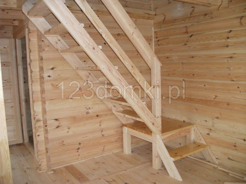 Dom drewniany z poddaszem, który prezentujemy na zdjęciach poniżej zmontowaliśmy wokół gotowego komina, bo dom będzie w przyszłości wyposażony w kominek. Komin w domu letniskowym właściciele najczęściej budują przed montażem domku. Oczywiście istnieje możliwość wybudowania komina po montażu. Schody drewniane wliczone są już w cenę.