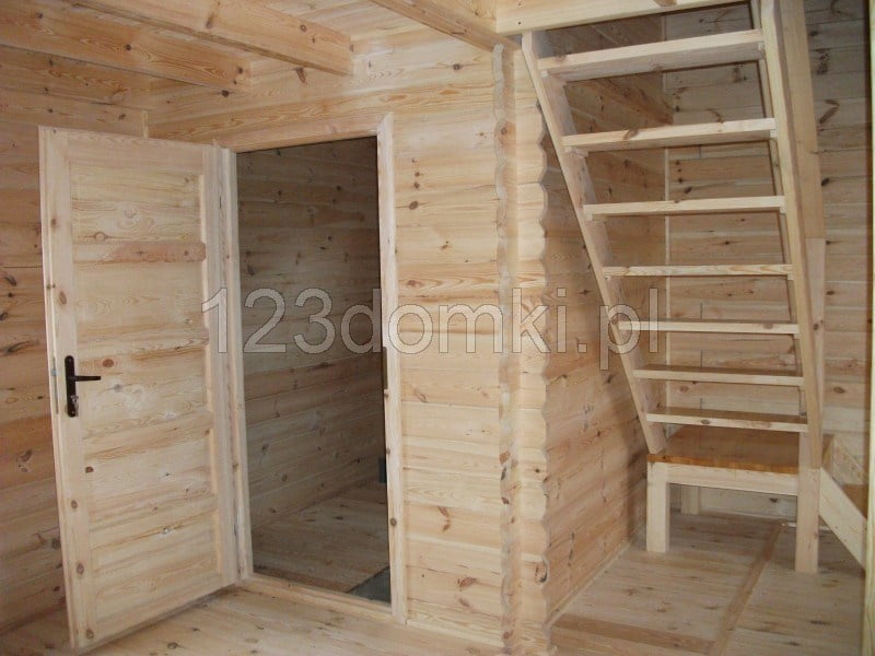Na parterze domku drewnianego znajduje się przestronna łazienka. Dzięki temu bez problemu zmieści się tutaj kabina prysznicowa, sedes, umywalka i niezbędne szafki łazienkowe. Łazienka w domku letniskowym to także miejsce, gdzie właściciele najczęściej umieszczają bojler z ciepła wodą. Z łazienki w domku drewnianym inwestorzy rozprowadzają także instalację wodną, zwykle do kuchni lub aneksu kuchennego. Obok łazienki domku drewnianego znajduje się miejsce na wygodny aneks kuchenny albo kuchnię. Pozostała część parteru stanowi otwartą przestrzeń z możliwością podzielenia i wydzielenia dodatkowej sypialni. Kolejne atuty to wygodne proste schody lub schody z podestem oraz wyjście na taras (także z możliwością powiększenia), który można zastąpić oknem balkonowym. Domek letniskowy z oknem tarasowym (balkonowym) świetnie się prezentuje i dodatkowo uzyskuje na atrakcyjności.