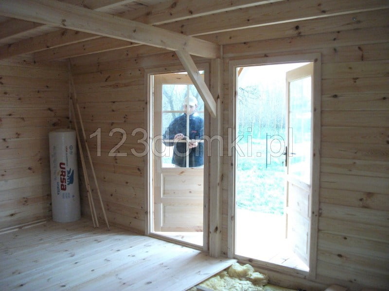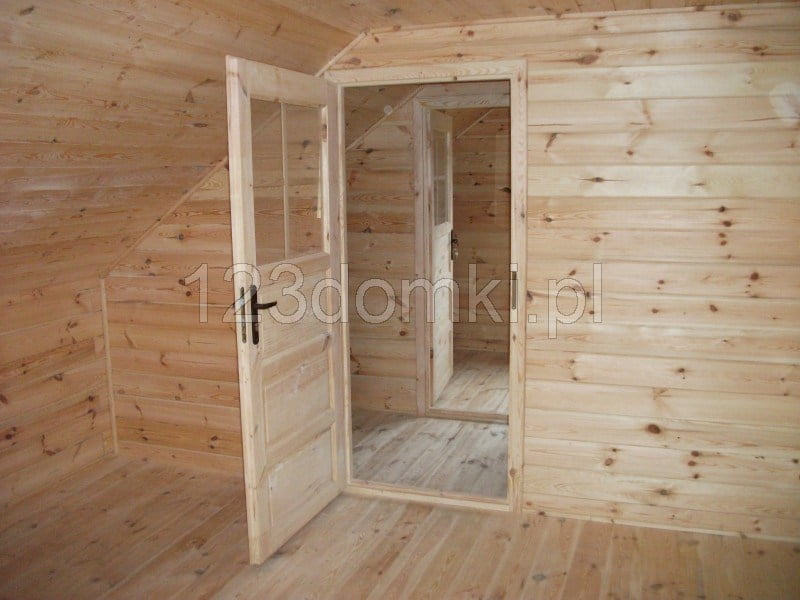 Dom w wersji letniskowej, nieocieplony. W opcji możliwość izolowania dachu wełną skalną a także wykonanie podbitki sufitowej w pomieszczeniach na poddaszu (jak na zdjęciu) oraz ocieplenia podłogi wełną mineralną lub styropianem. Możliwość wykonania jako domek letniskowy całoroczny i dodatkowo ocieplenie ścian domku całorocznego wełną mineralną 100mm lub 150mm. W domku całorocznym zalecamy wymianę okien letniskowych na okna całoroczne pcv oraz wymianę drzwi wejściowych na całoroczne ocieplane drzwi stalowe. Kolor drzwi całorocznych oraz okien pcv ustalamy z właścicielem przy zamówieniu domku całorocznego.