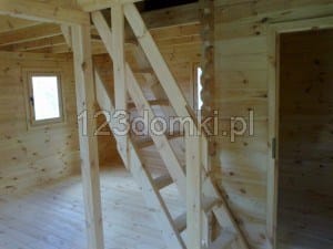 Na poddasze domu prowadzą proste schody jednobiegowe, tzw. młynarskie z prostą barierką i poręczą, dzięki czemu oszczędzamy powierzchnię parteru. Schody mogą być zarówno po środku domku (jeżeli planujemy podział poddasza) jak i przy ścianie szczytowej (jeżeli chcemy uzyskać dużą, otwartą i niepodzieloną przestrzeń poddasza). Dla osób szukających wygodniejszego rozwiązania, możemy zastosować w domku z poddaszem schody z podestem. Należy jednak pamiętać, że zajmują one dużo więcej miejsca, dlatego najlepiej sprawdza się w domkach 30m2 lub 35m2.