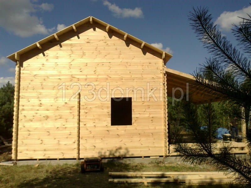 Ściany: wykonane z prostokątnego balika drewnianego o grubości 45mm. Dom w całości wykonany z drewna suszonego komorowo, a nie sezonowanego, dzięki czemu pozbyliśmy się drobnoustrojów i larw owadów, zarodków grzybów i pleśni. Dodatkowo uzyskaliśmy precyzyjnie obrobione, czterostronnie strugane drewno, idealne wymiary i jakość powierzchni, więc drewno nie rozsycha się po montażu. W naszych domach drewnianych stosujemy podwójne pióro-wpust, więc otrzymujemy bardzo szczelne połączenie balików. Po wstawieniu odpowiedniej konstrukcji oraz ociepleniu ścian wełną mineralną uzyskamy bez problemy domek letniskowy całoroczny.