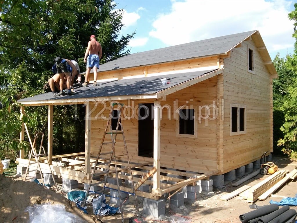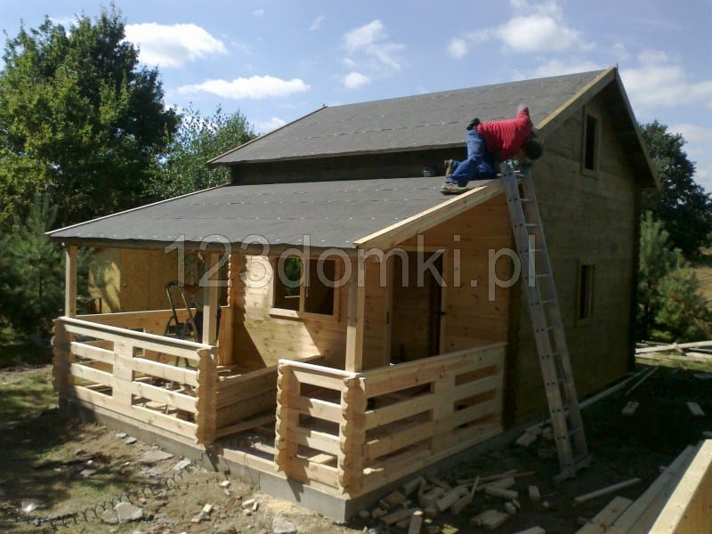 Dach: pełne deskowanie z desek struganych 21mm, łączonych szczelnie na pióro-wpust, na belkach 140x70mm, standardowo kryty papą, ale możliwe jest zastosowanie innego pokrycia dachu, np. gont bitumiczny w dowolnym kolorze.