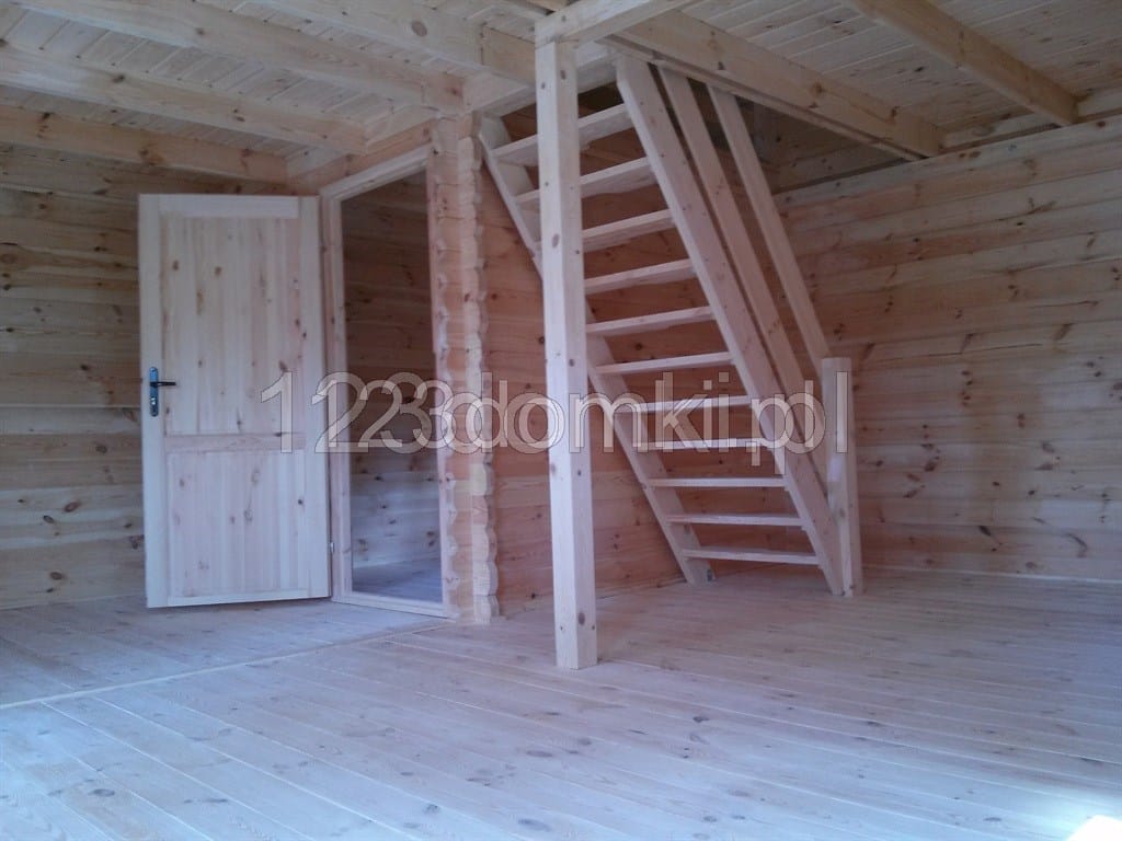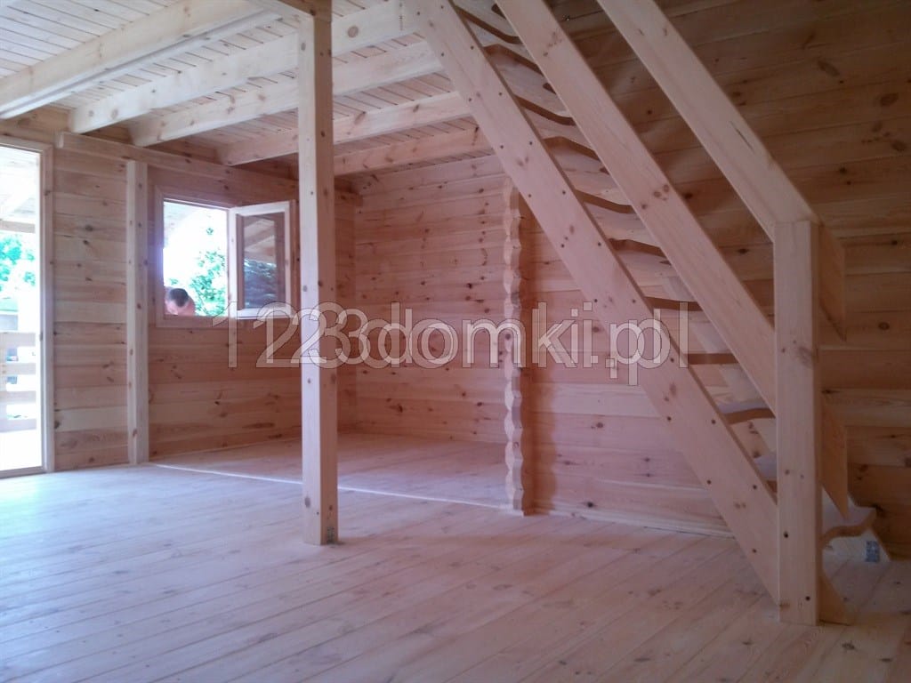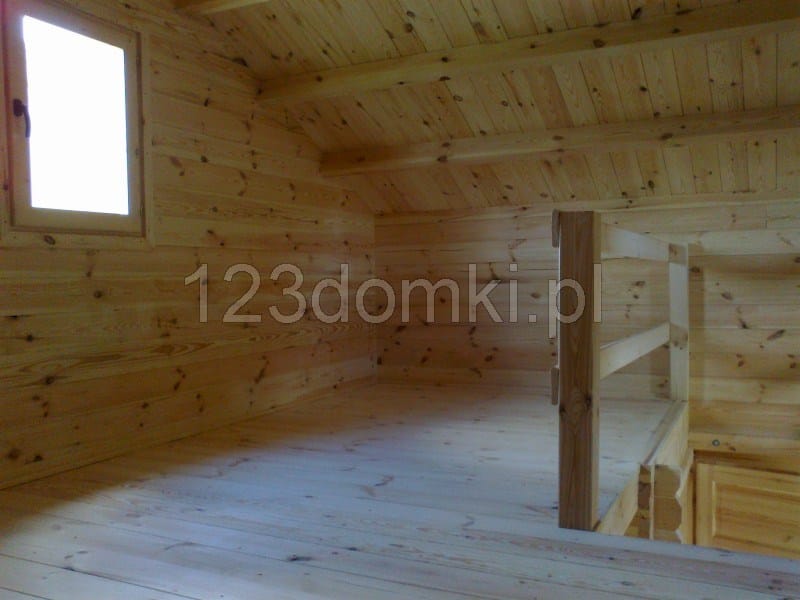 Podłoga: gruba deska podłogowa 28mm na legarach drewnianych impregnowanych, wykonana z desek struganych czterostronnie, łączonych na pióro-wpust. Rozstaw legarów pod podłogą domku jest dobrany w taki sposób, aby podłoga nie uginała się pod ciężarem osób oraz mebli.