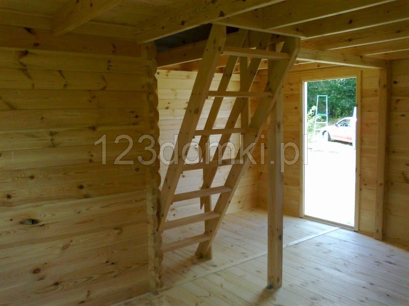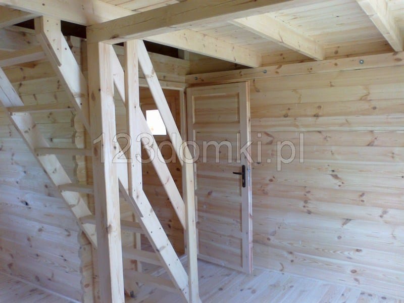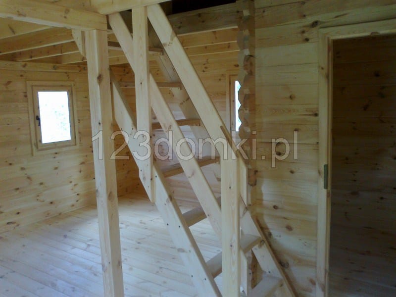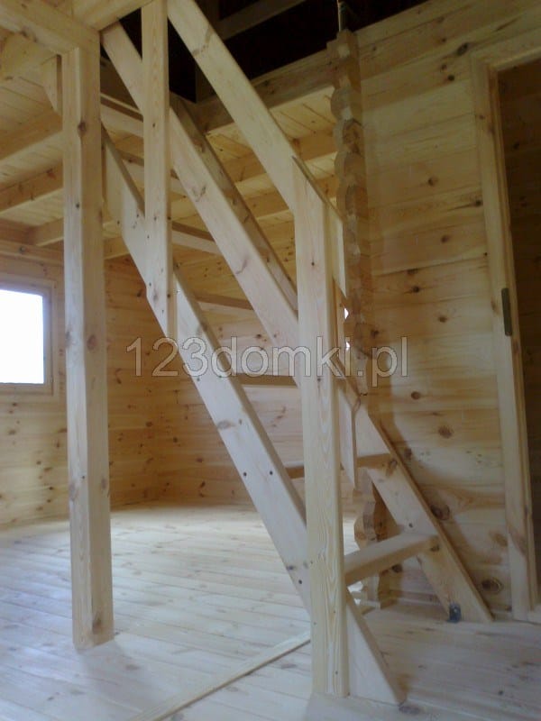 Na poddasze domu prowadzą proste schody jednobiegowe, tzw. młynarskie z prostą barierką i poręczą, dzięki czemu oszczędzamy powierzchnię parteru. Schody mogą być zarówno po środku domku (jeżeli planujemy podział poddasza) jak i przy ścianie szczytowej (jeżeli chcemy uzyskać dużą, otwartą i niepodzieloną przestrzeń poddasza). Dla osób szukających wygodniejszego rozwiązania, możemy zastosować w domku z poddaszem schody z podestem. Należy jednak pamiętać, że zajmują one dużo więcej miejsca, dlatego najlepiej sprawdza się w domkach 30m2 lub 35m2.