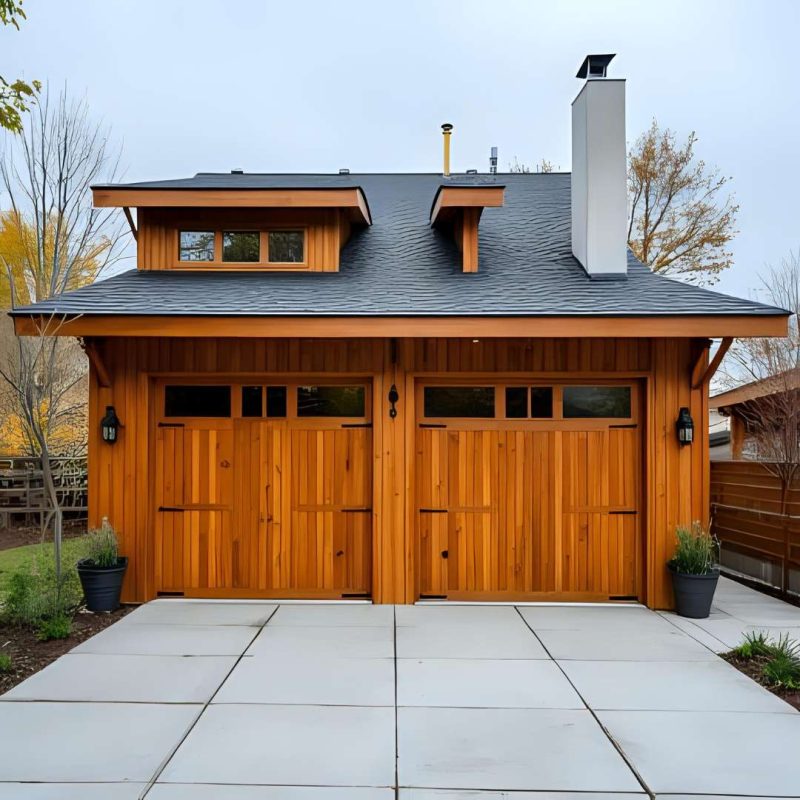 • garaż drewniany dwustanowiskowy na dwa auta z dwoma bramami o powierzchni do 35m2 - zbliżenie - widoczne detale garażu oraz bram Garaż drewniany dwustanowiskowy 6x6 580x580 35m2 Gar66-2S