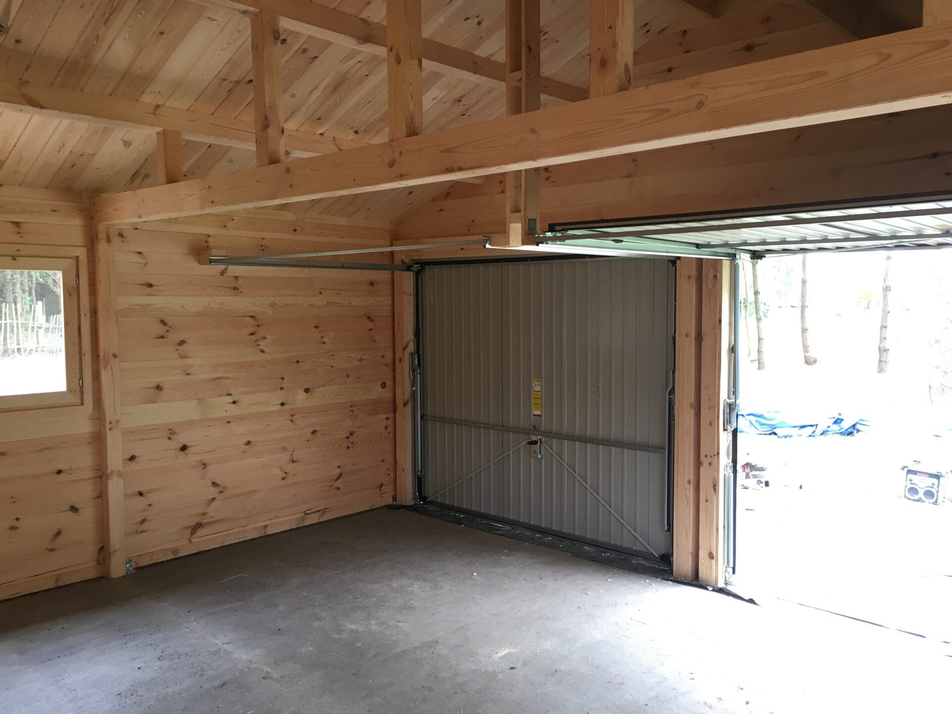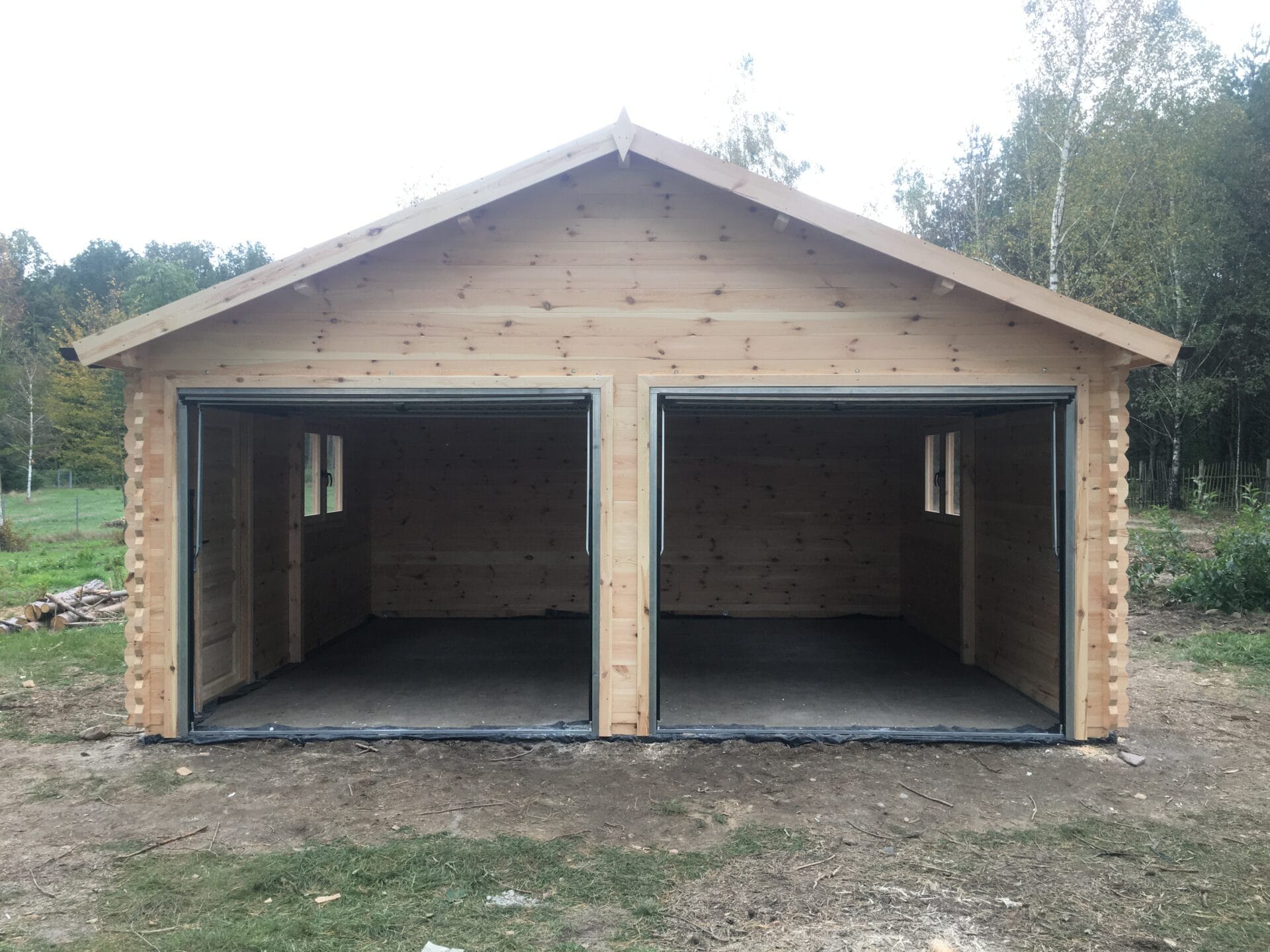 Garaż drewniany dwustanowiskowy o wymiarach 600x500cm. Wymiary wewnątrz 593x493cm. Wymiary balików 620x520cm (wystają 10cm w narożnikach).