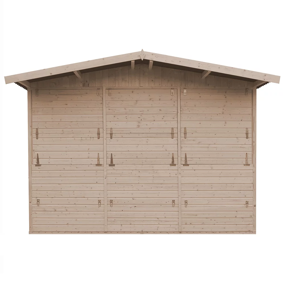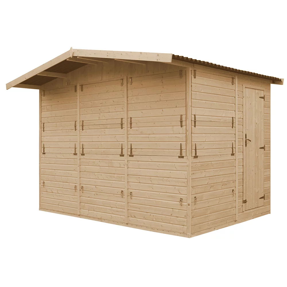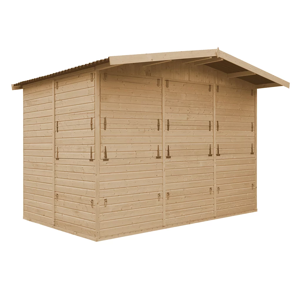 Domek drewniany o wymiarach 3x2m (front x głębokość) i wysokości 2,3m (300x200x230cm Szer x Gł x Wys). Daszek na froncie wystaje o dodatkowe 50cm. Po rozłożeniu wszystkich lad domki zajmą przestrzeń ok. 400x250cm.
