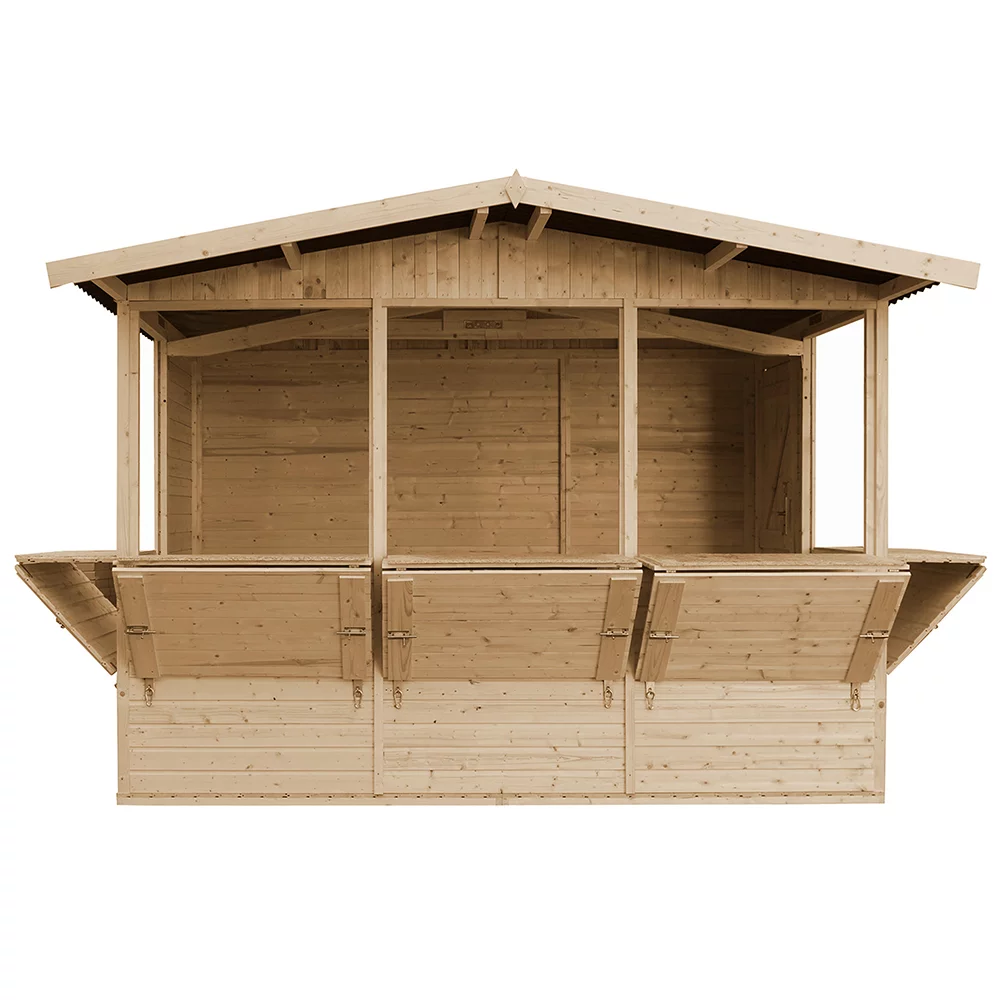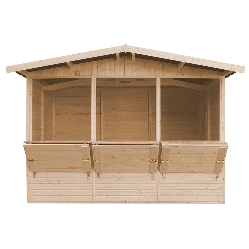 Ściany wykonane z paneli obitych najwyższej jakości boazerią drewnianą umożliwiają szybki i bezproblemowy montaż i demontaż domku handlowego.